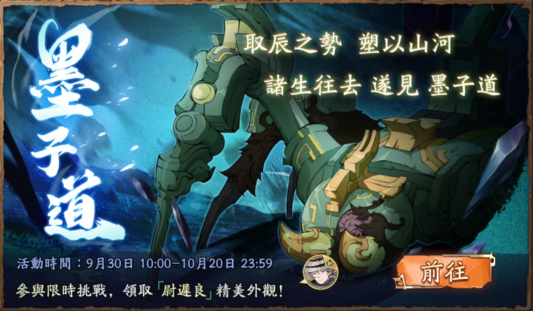 ➤活動期間,通關劇情及挑戰關卡,獲得任務積分。累計任務積分獲得靈蘊石、絕品隨機魂石、時之印等獎勵,還有尉遲良限定外觀「墨子道」限時贏取。