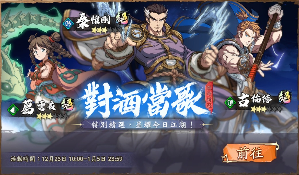 ➤對酒當歌限時精選開啟,您從本活動中召喚的首個絕品英靈,必為古倫德&葛雲衣&秦惟剛三名絕品英靈中您尚未獲得的英靈。(英靈絕學介紹可前往遊戲內“資訊”查看)
