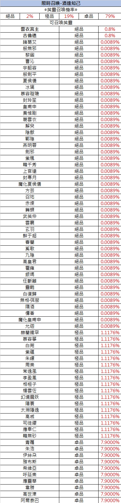 ➤在心願召喚卡池中召喚獲得絕品英靈時,有80%的機率獲得卡池內的2名心願英靈之一,每名心願英靈出現的機率為40%;