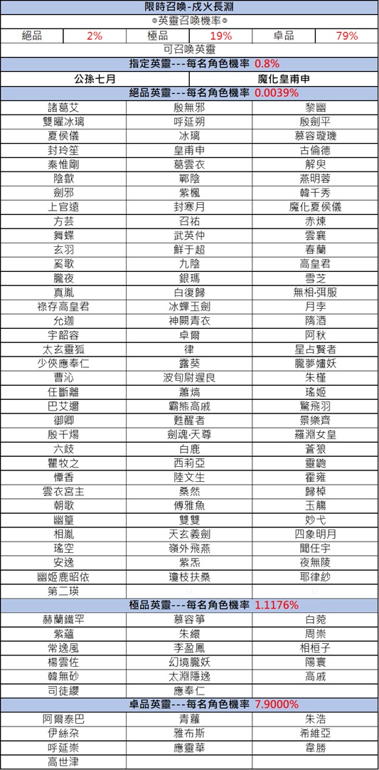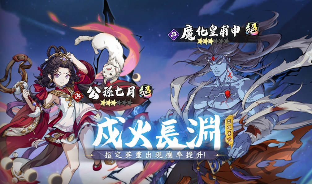 ➤戍火長淵限定召喚開啟,絕品英靈公孫七月、魔化皇甫申召喚機率提升。(更多英靈絕學介紹可前往遊戲內“資訊”查看)